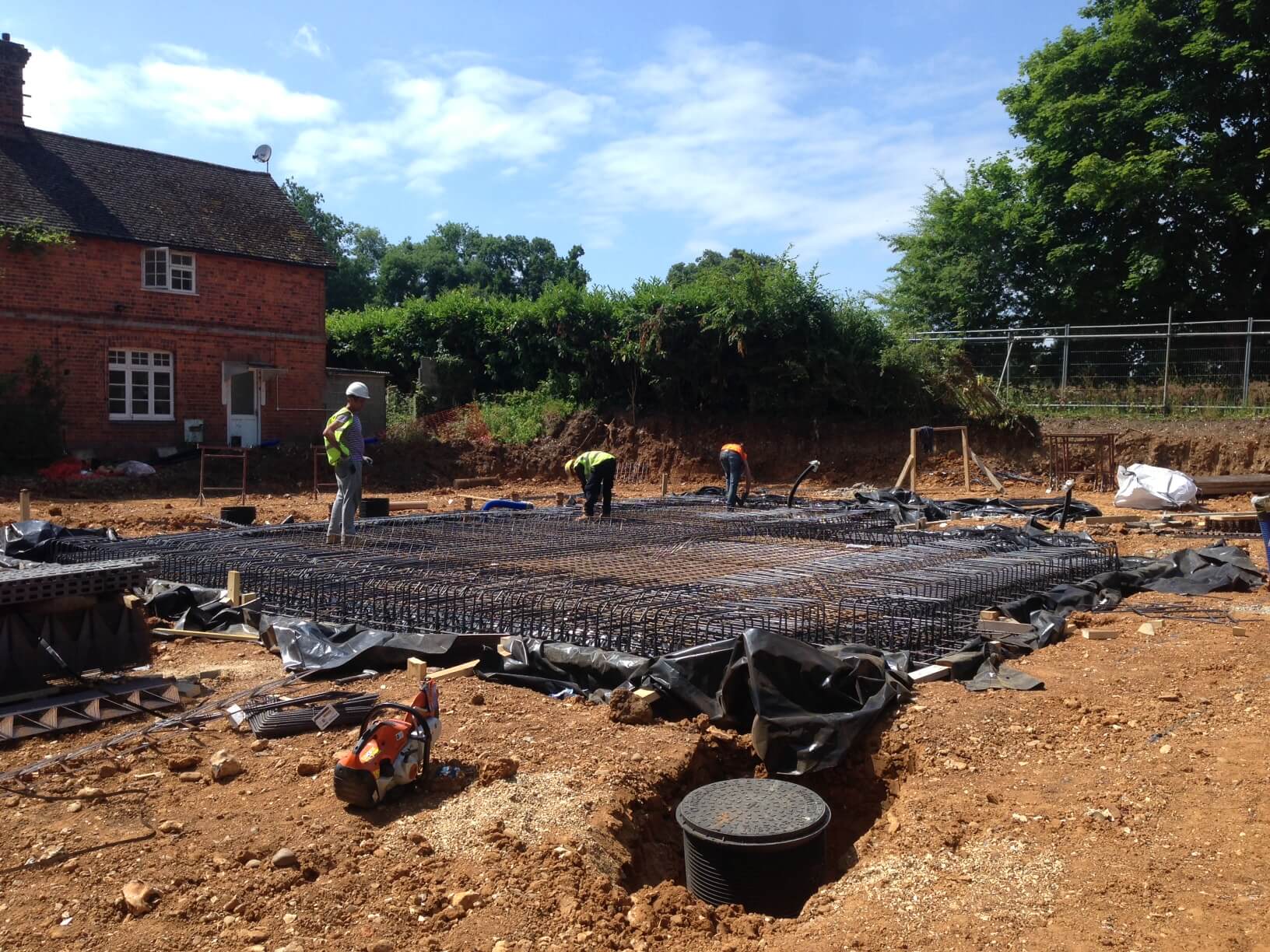 Construction of concrete raft foundations for eight residential plots including concrete raft slabs for garages in each plot.
