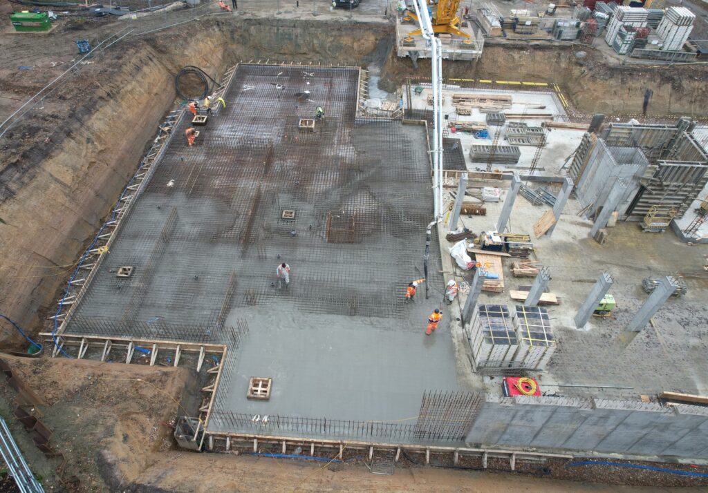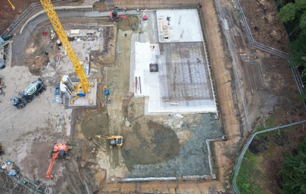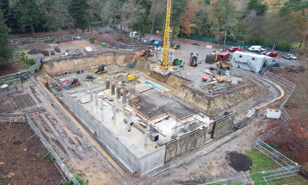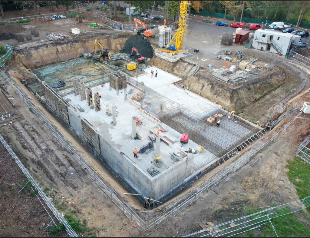 This super-home basement in the Greater London area was recently completed by Murform for a valued client. Our scope of work included site enabling and access road construction, piling, and the implementation of a full de-watering strategy. We successfully executed a 14,000m³ bulk excavation, a 1,500m² reinforced concrete basement with a curved entrance ramp, and a 500m² below-ground reinforced concrete irrigation tank, along with all associated site drainage and services.